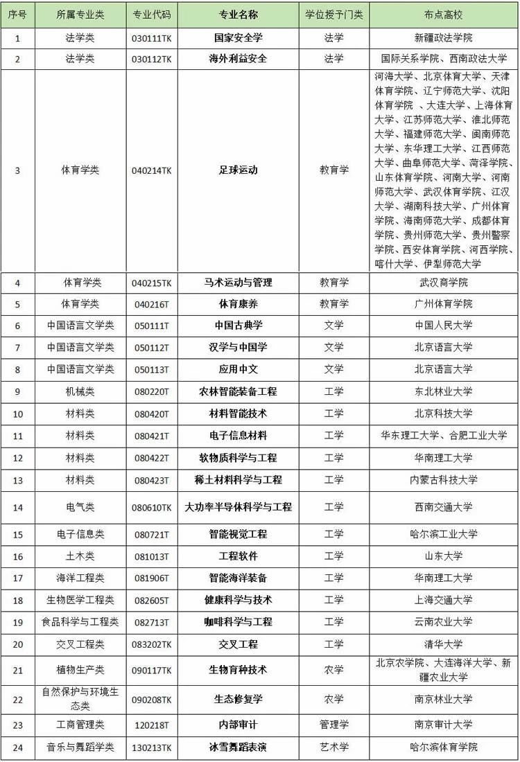 日前,教育部公布了2023年度普通高等學(xué)校本科專業(yè)備案和審批結(jié)果,并發(fā)布2024年普通高等學(xué)校本科專業(yè)目錄。其中,電子信息材料、軟物質(zhì)科學(xué)與工程、大功率半導(dǎo)體科學(xué)與工程、生物育種技術(shù)、生態(tài)修復(fù)學(xué)、健康科學(xué)與技術(shù)、智能視覺工程、足球運動、咖啡科學(xué)與工程等24種新專業(yè)(詳見表格)正式納入