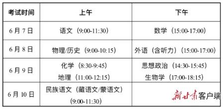 考試具體時間安排為:6月7日上午考語文,下午考數(shù)學;6月8日上午考物理/歷史,下午考外語(含聽力);6月9日上午考化學和地理,下午考思想政治和生物學;6月10日上午考民族語文(藏語文、蒙語文)。