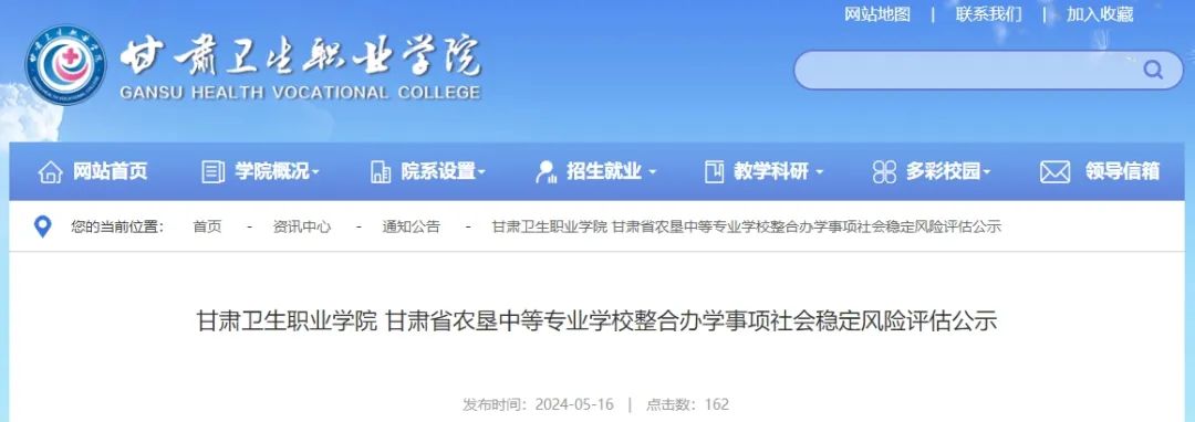 甘小教從甘肅衛(wèi)生職業(yè)學(xué)院獲悉,甘肅衛(wèi)生職業(yè)學(xué)院 甘肅省農(nóng)墾中等專業(yè)學(xué)校整合辦學(xué)事項社會穩(wěn)定風(fēng)險評估正在公示中。