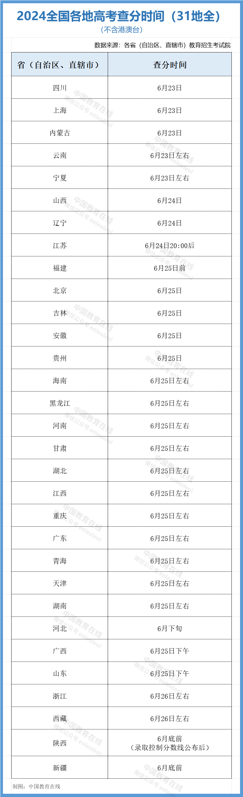 據(jù)全國各省(自治區(qū)、直轄市)教育招生考試院消息,截至目前,全國31個?。ㄖ陛犑?、自治區(qū))[注:不含港澳臺] 都已公布了今年高考成績查詢時間及相關(guān)信息。