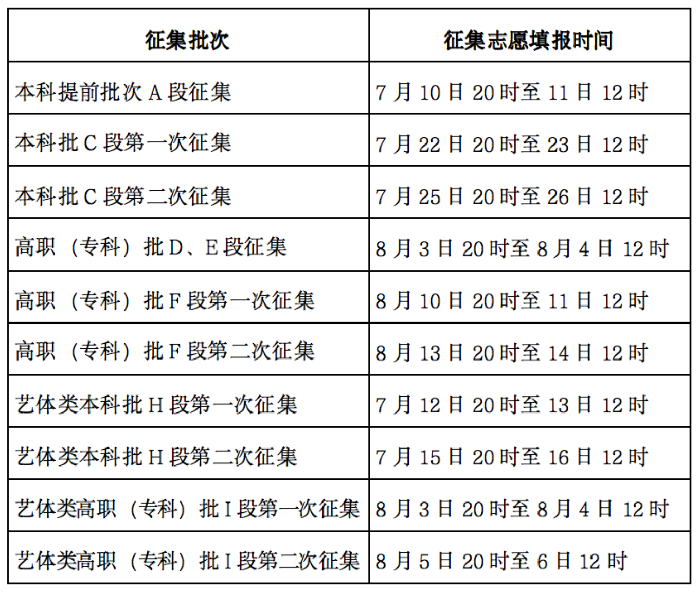 填報批次為:本科提前批(A段),本科批(B段、C段),高職(專科)提前批(D段、E段),藝體類本科提前批(G段),藝體類本科批(H段)。