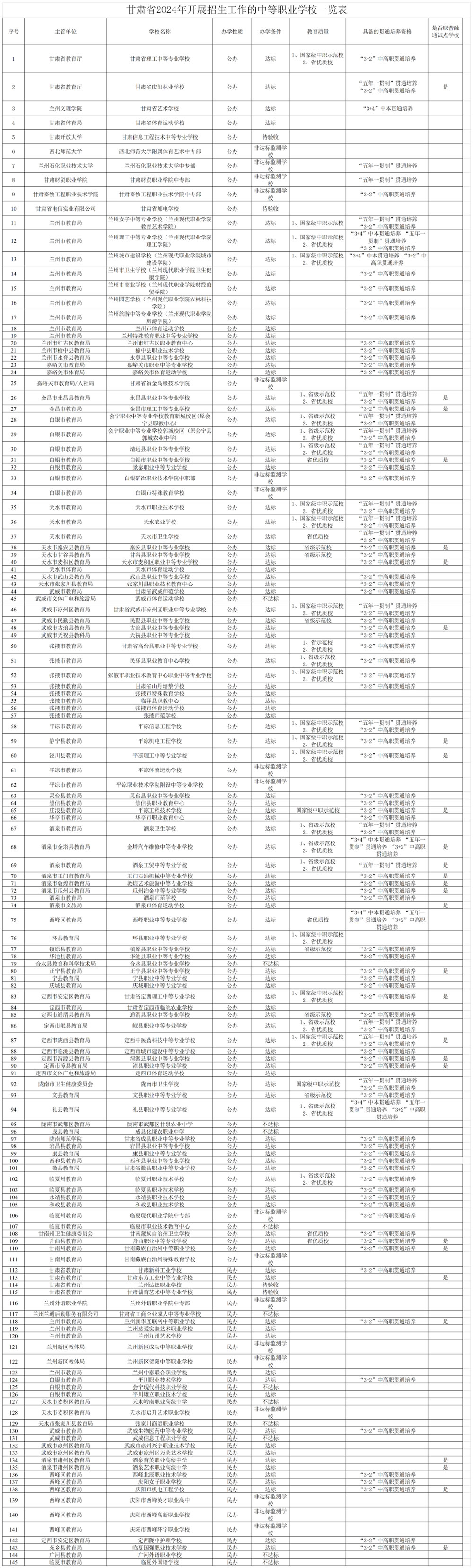 2024年甘肅省一共有145所中等職業(yè)學(xué)校招生,省屬7所,高等學(xué)校管理8所,企業(yè)管理2所,市(州)屬58所,縣(區(qū)、市)屬70所,公辦111所,民辦34所,辦學(xué)條件達(dá)標(biāo)115所,省級(jí)優(yōu)質(zhì)學(xué)校31所,具體見(jiàn)附表(文末)。