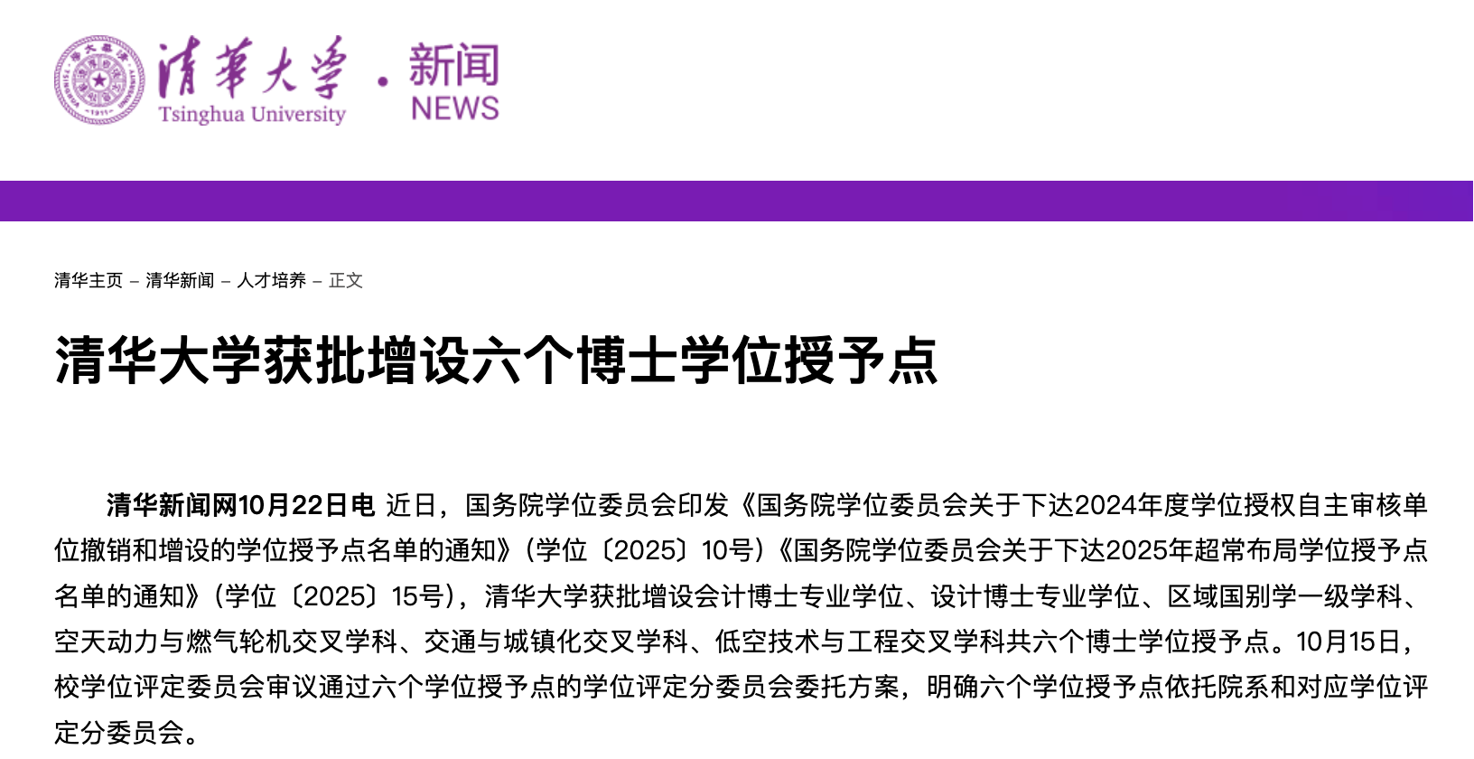 據(jù)清華大學(xué)新聞網(wǎng)消息,近日,國務(wù)院學(xué)位委員會印發(fā)《國務(wù)院學(xué)位委員會關(guān)于下達(dá)2024年度學(xué)位授權(quán)自主審核單位撤銷和增設(shè)的學(xué)位授予點(diǎn)名單的通知》(學(xué)位〔2025〕10號)《國務(wù)院學(xué)位委員會關(guān)于下達(dá)2025年超常布局學(xué)位授予點(diǎn)名單的通知》(學(xué)位〔2025〕15號),清華大學(xué)獲批增設(shè)會計(jì)博士專業(yè)學(xué)位、設(shè)計(jì)博士專業(yè)學(xué)位、區(qū)域國別學(xué)一級學(xué)科、空天動(dòng)力與燃?xì)廨啓C(jī)交叉學(xué)科、交通與城鎮(zhèn)化交叉學(xué)科、低空技術(shù)與工程