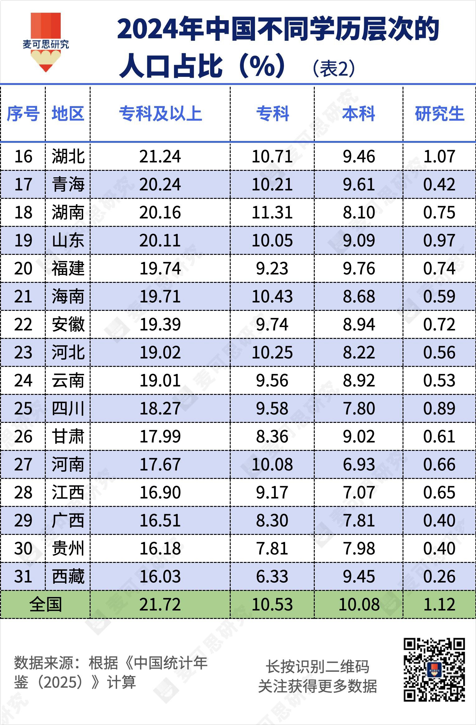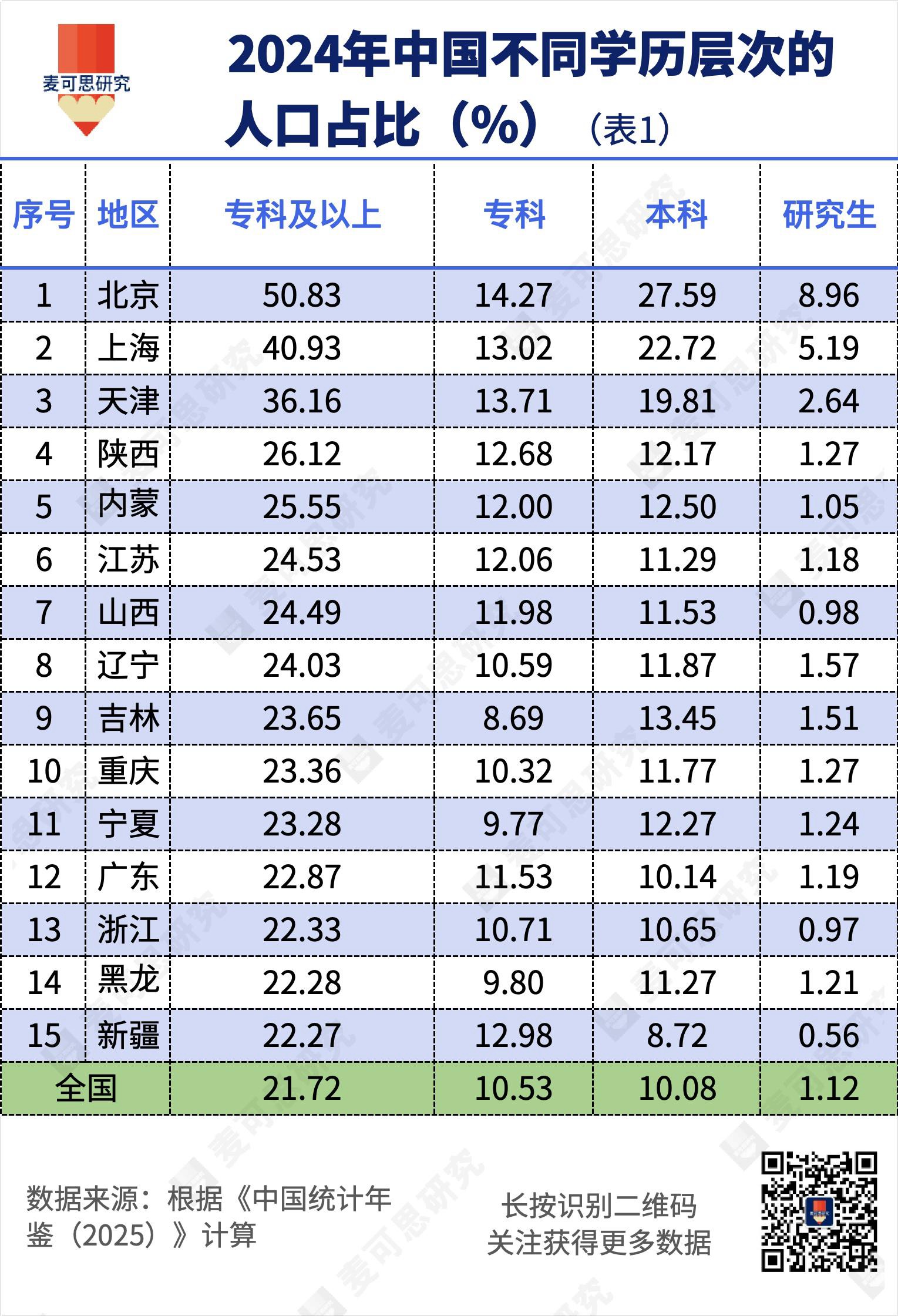 依據《中國統(tǒng)計年鑒(2025)》的數(shù)據計算,2024年,我國受教育人口中(6歲及以上,下同),擁有大學??萍耙陨蠈W歷的占比為21.72%,較2023年的19.20%有所提升,相當于全國每5人就有1人是大學生。同時,高學歷人口占比也在增加,具有大學本科和研究生學歷的人口占比依次為10.08%、1.12%,超過2023年的8.57%、0.95%。北京、上海、天津位居全國前三位。其中,北京??萍耙陨蠈W歷人口占比超過50%,是我國大學生“濃度”最高的地區(qū)。