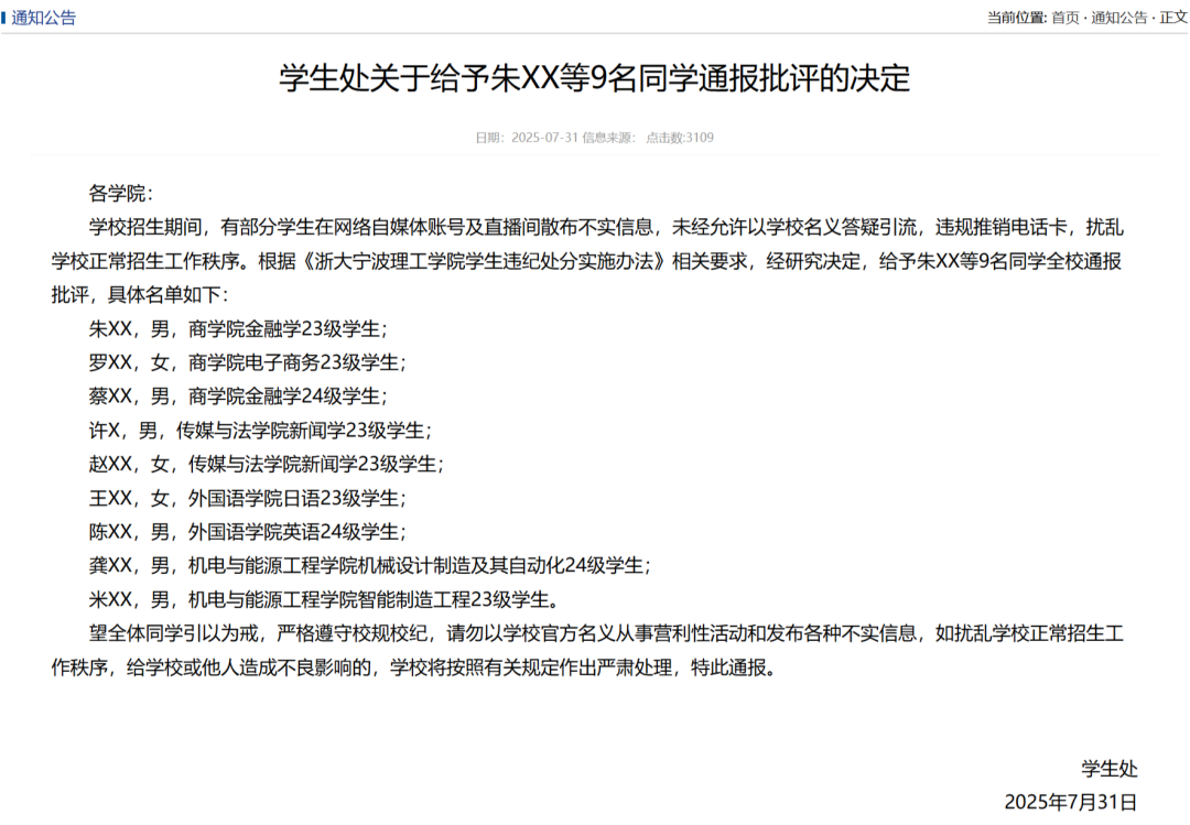 “學(xué)校招生期間,有部分學(xué)生在網(wǎng)絡(luò)自媒體賬號(hào)及直播間散布不實(shí)信息,未經(jīng)允許以學(xué)校名義答疑引流,違規(guī)推銷電話卡,擾亂學(xué)校正常招生工作秩序。根據(jù)《浙大寧波理工學(xué)院學(xué)生違紀(jì)處分實(shí)施辦法》相關(guān)要求,經(jīng)研究決定,給予朱XX等9名同學(xué)全校通報(bào)批評(píng)?!?/span>