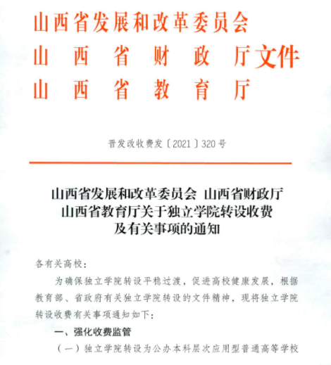 近日,山西省發(fā)改委、省財(cái)政廳、省教育廳發(fā)布文件,確定獨(dú)立學(xué)院轉(zhuǎn)設(shè)之后的收費(fèi)事項(xiàng),保障獨(dú)立學(xué)院轉(zhuǎn)設(shè)平穩(wěn)過渡,促進(jìn)高校健康發(fā)展。