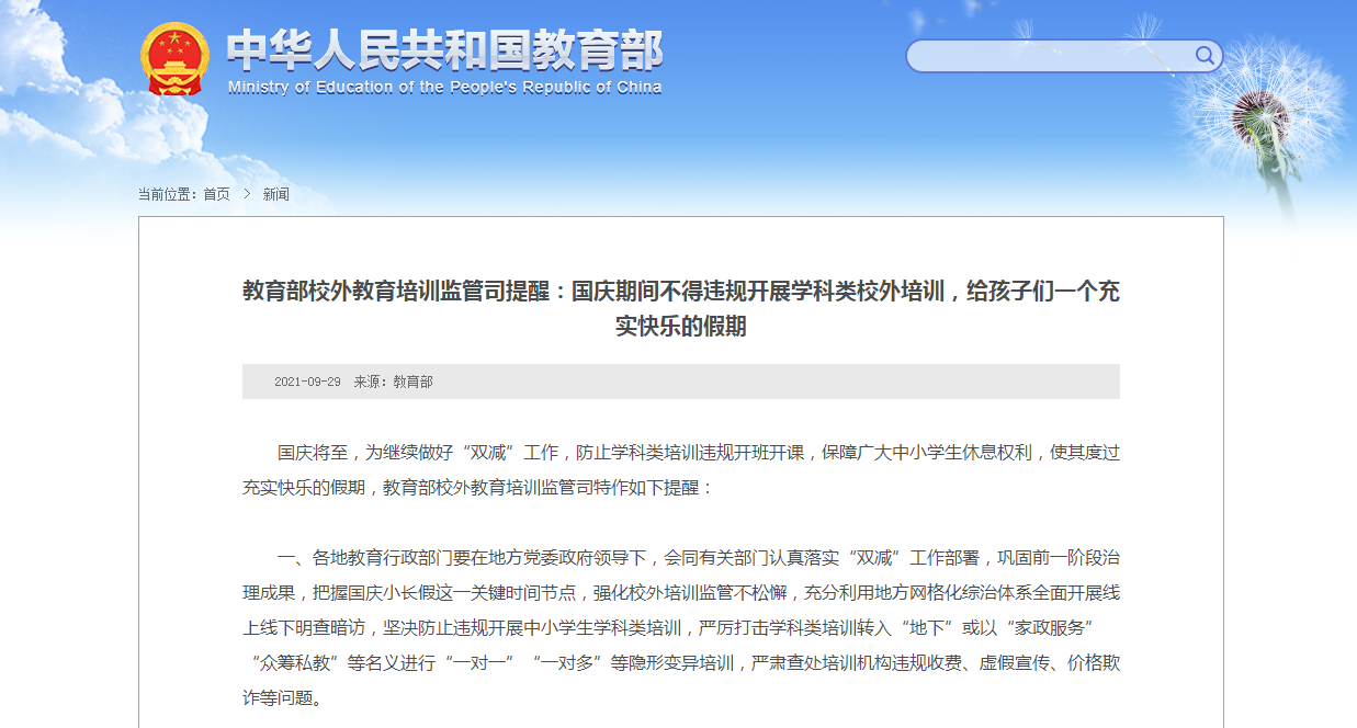 據(jù)教育部網(wǎng)站,國(guó)慶將至,為繼續(xù)做好“雙減”工作,防止學(xué)科類培訓(xùn)違規(guī)開班開課,保障廣大中小學(xué)生休息權(quán)利,使其度過充實(shí)快樂的假期,教育部校外教育培訓(xùn)監(jiān)管司特作如下提醒: