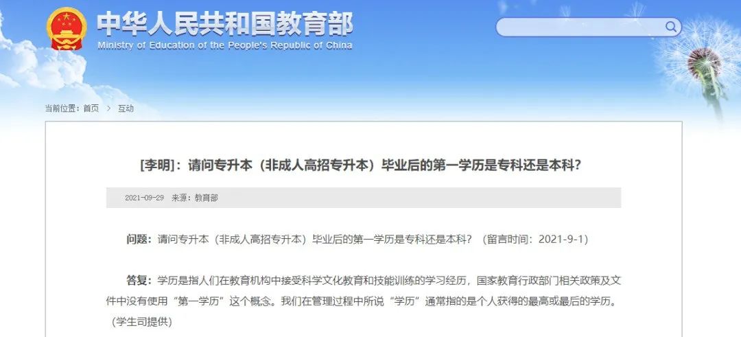 日前,教育部針對網(wǎng)友提問“請問專升本(非成人高招專升本)畢業(yè)后的第一學歷是??七€是本科?”進行答復稱: