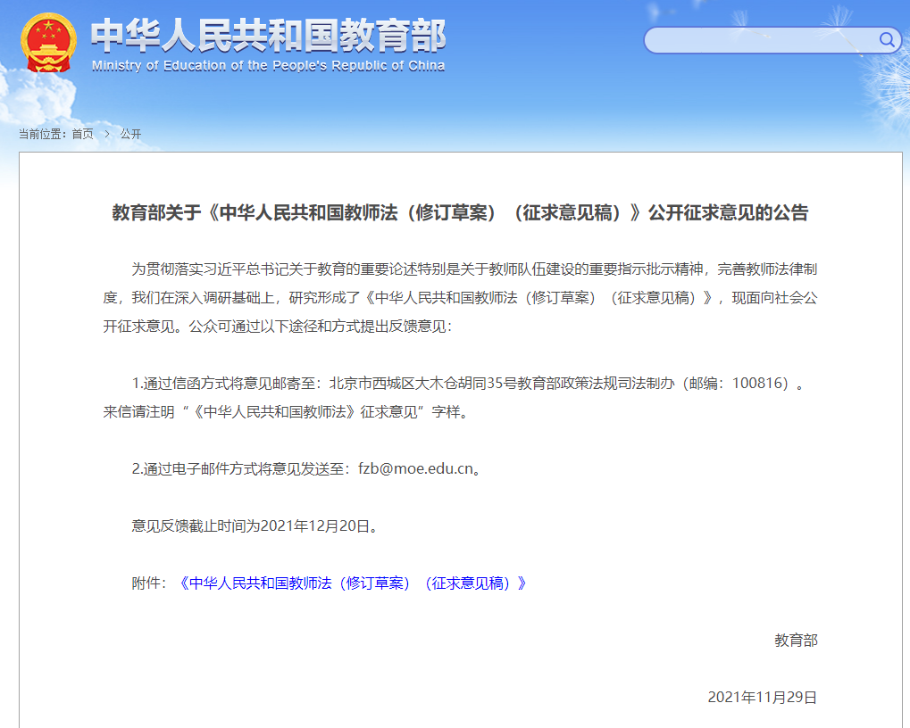 11月29日,教育部發(fā)布公告,就《中華人民共和國教師法(修訂草案)(征求意見稿)》面向社會公開征求意見。其中就有提到教師資格應(yīng)當(dāng)具備的相應(yīng)學(xué)歷學(xué)位。