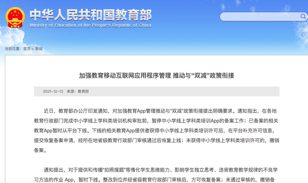 12月13日,教育部辦公廳印發(fā)通知,對加強(qiáng)教育App管理推動與“雙減”政策銜接提出明確要求。通知提出,
