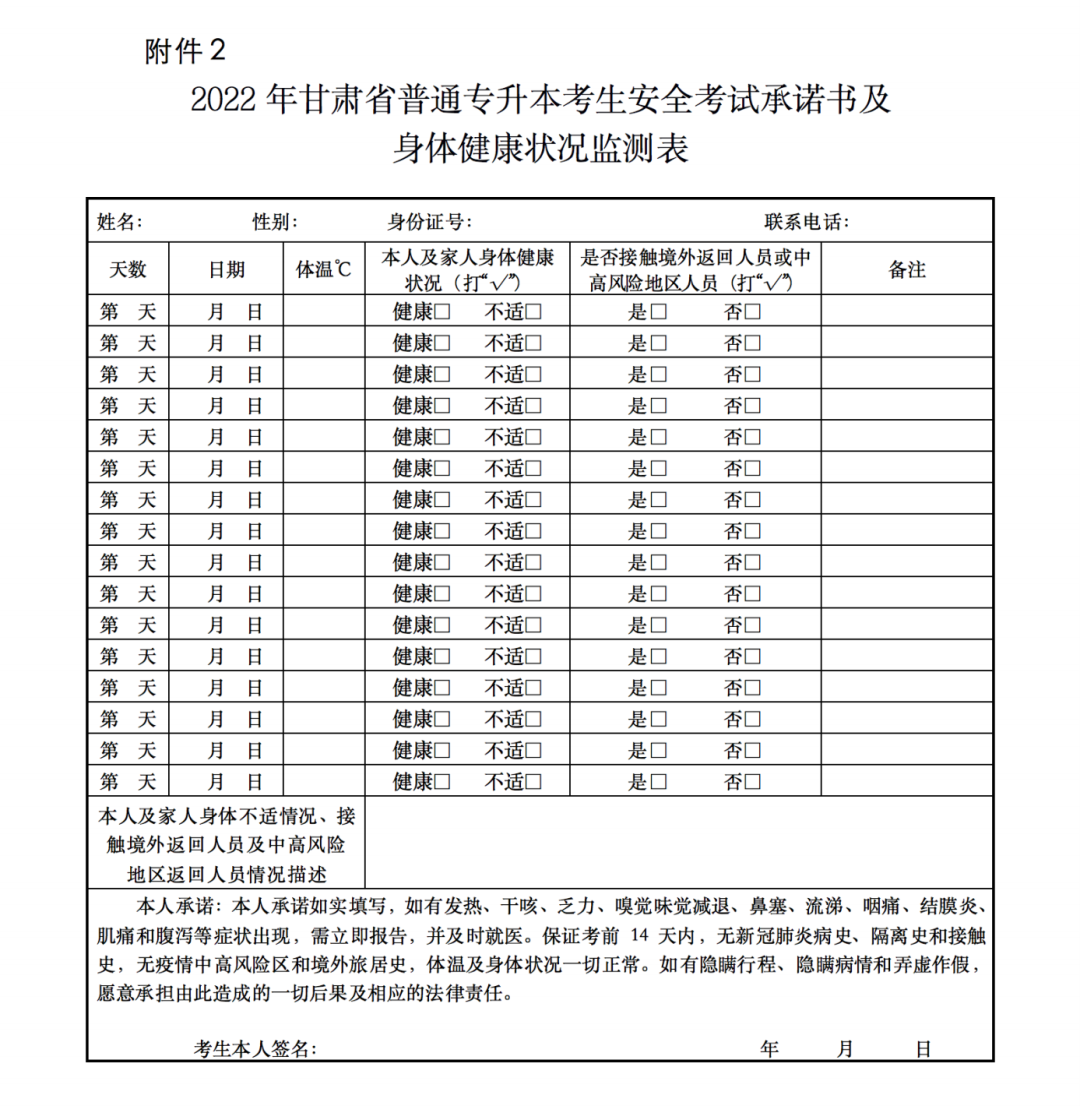 2. 2022年甘肅省普通專升本考生安全考試承諾書及身體健康狀況監(jiān)測表