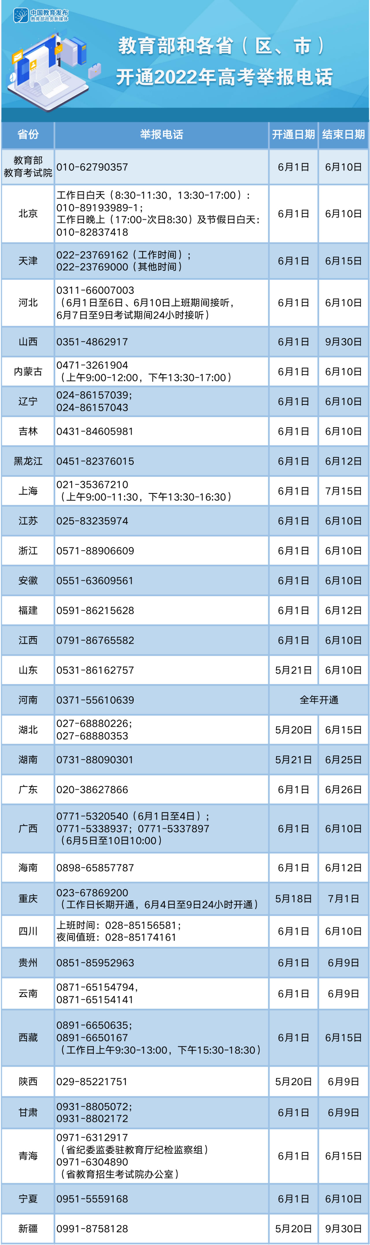 近日,教育部統(tǒng)一公布了教育部以及省級教育行政部門和招生考試機(jī)構(gòu)2022年的高考舉報(bào)電話,歡迎廣大考生、家長及社會各界人士及時舉報(bào)反映涉及2022年高考的問題線索。教育部及各省(區(qū)、市)將會同有關(guān)部門根據(jù)舉報(bào)線索第一時間核查處理,堅(jiān)決維護(hù)高考公平公正。